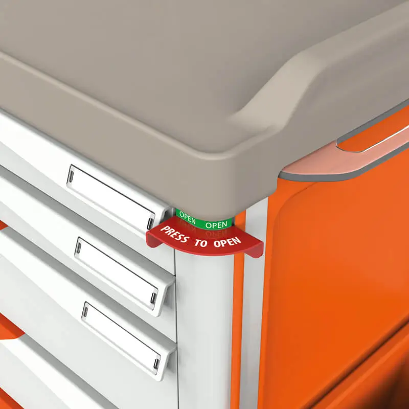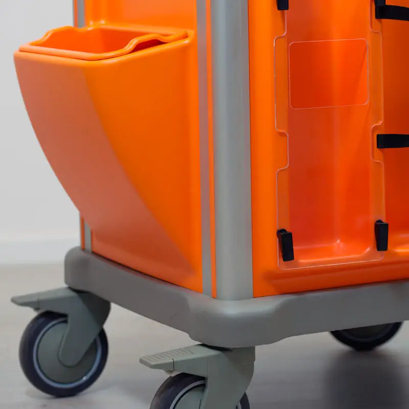 For additional functionality, the PLT43C5 configuration includes an integrated waste bin positioned on the right side of the trolley. The left side incorporates a cardiac massage board, while the rear provides holders for both catheters and an oxygen tank. A secure safety lock and seal system ensures controlled access to the drawers when not in use.
